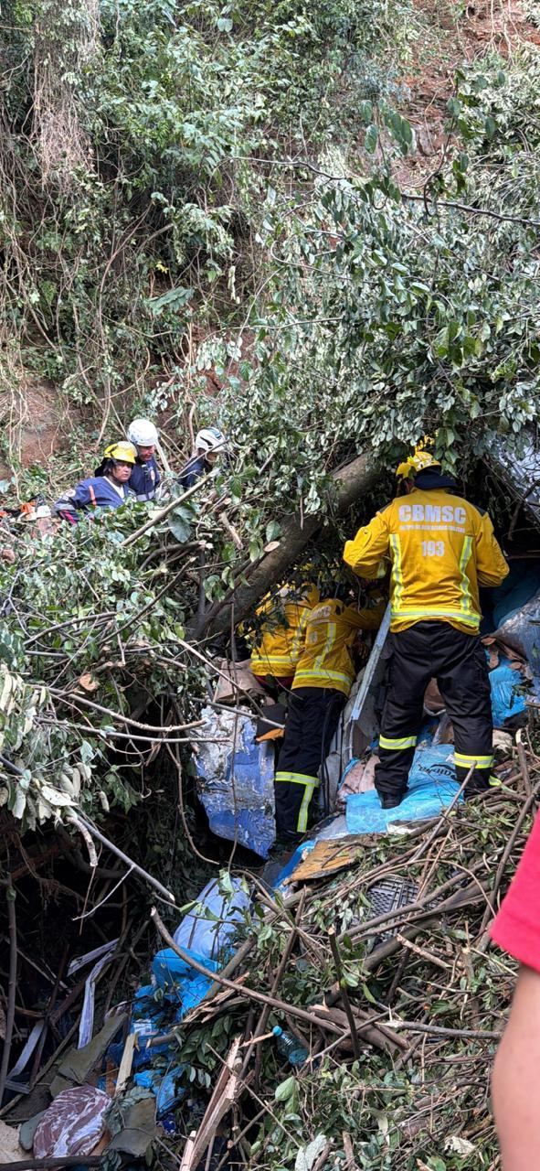 Concomitantemente foi observado no caminhão que o condutor estava preso nas ferragens. A guarnição não tinha contato visual com a vítima, apenas por voz. A vítima relatou que estava com seu membro inferior e superior do lado esquerdo presos. Foram horas de intenso trabalho utilizando serra sabre, cilindro, ferramenta expansora, tesoura, cinta catraca, motosserra dentre outros materiais para buscar o acesso à vítima.