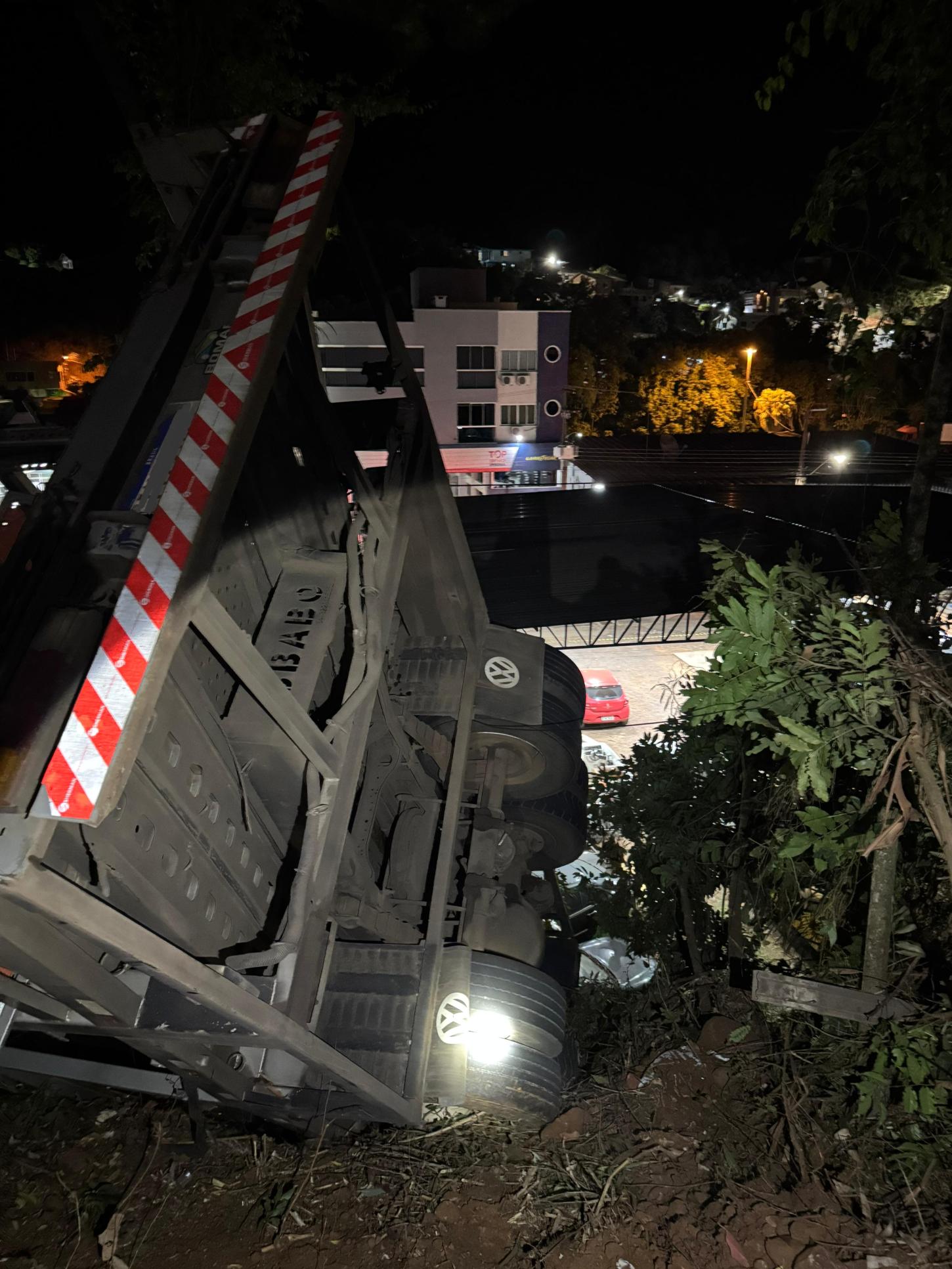 APÓS OS PROCEDIMENTOS, FOI COLOCADO FITA ZEBRADA NO LOCAL, BEM COMO NA RUA ACIMA (A QUE O CAMINHÃO VEIO A CAIR). POLÍCIA MILITAR E CELESC APOIARAM NA CENA.
