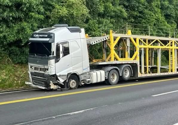 A colisão aconteceu por volta das 7h45 e envolveu duas carretas e uma picape. Uma das carretas, do tipo graneleira carregada com milho, possui placas de Coronel Freitas. A outra é uma carreta cegonha com placas de São Bernardo do Campo. Já a picape tem placas de Pato Branco.