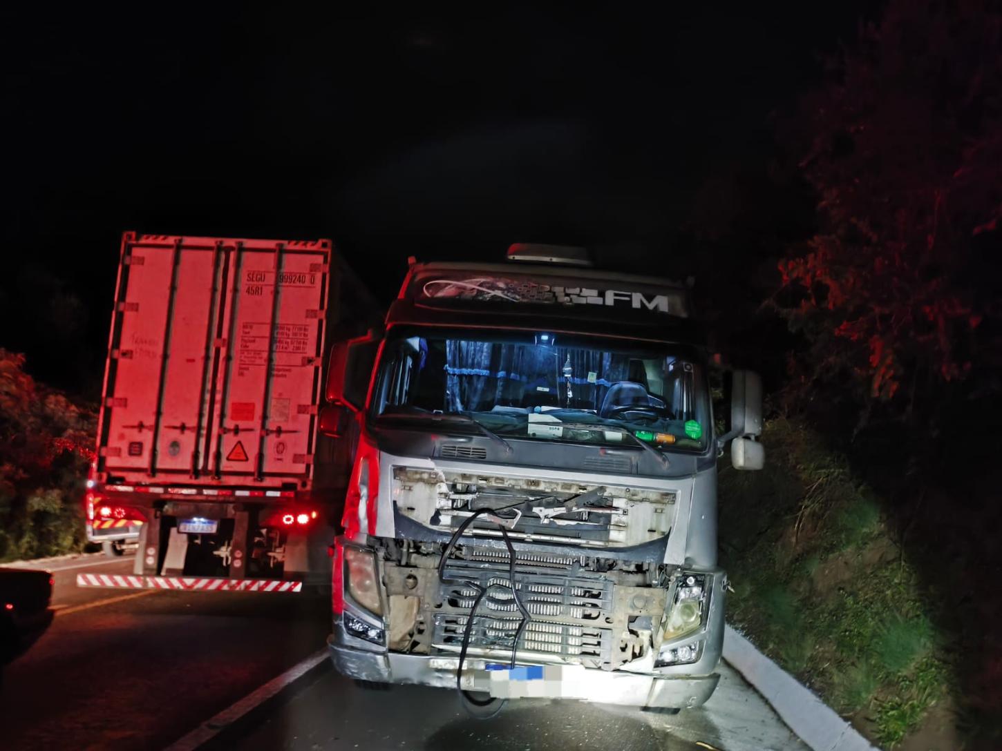 Ao chegar no local da ocorrência, confirmou-se a sua natureza, tratando-se de uma colisão de um veículo de passeio (VW GOL) e um caminhão (VOLVO FH). O condutor do caminhão não sofreu qualquer ferimento, dispensando atendimento e transporte.