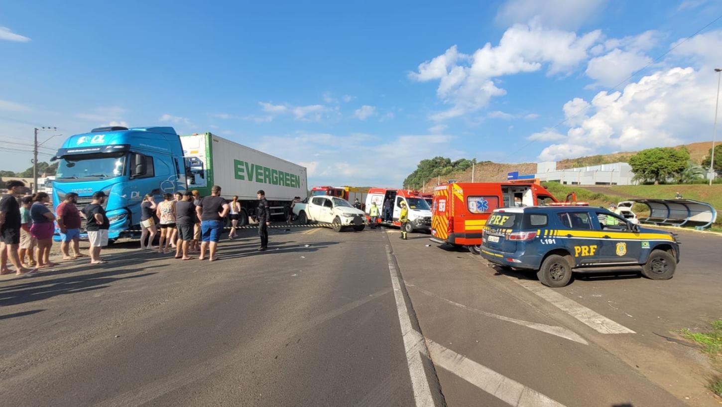 POR VOLTA DE 08H20M, DESTE SÁBADO (21), NA BR-282 EM CORDILHEIRA ALTA, PRÓXIMO A EMPRESA PERFIAÇO, ATENDIDO ACIDENTE DE TRÂNSITO ENVOLVENDO CAMINHÃO E DOIS VEÍCULOS, COM 3 VÍTIMAS ENVOLVIDAS.