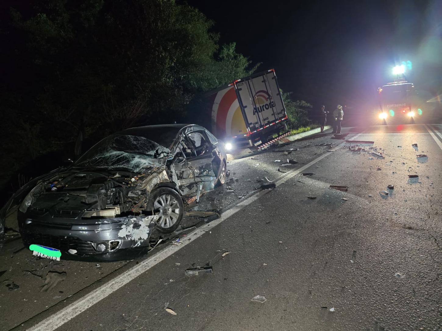 Ao chegar no local, a GU deparou-se com colisão frontal entre carro-caminhão com duas vítimas, ocupantes do veículo menor, encontradas fora do veículo, necessitando de atendimento.