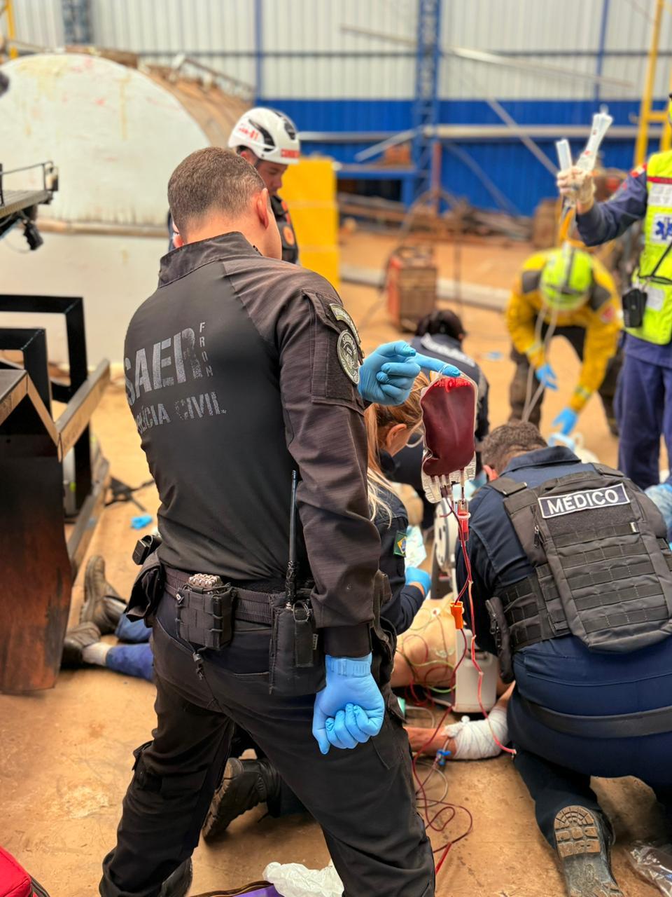 Um funcionário, masculino, 41 anos, devido a explosão de um tonel de óleo, possivelmente ocasionada pela presença de gases no seu interior, sofreu traumatismo crânio encefálico, com perda de sangue considerável e parada cardiorrespiratória.