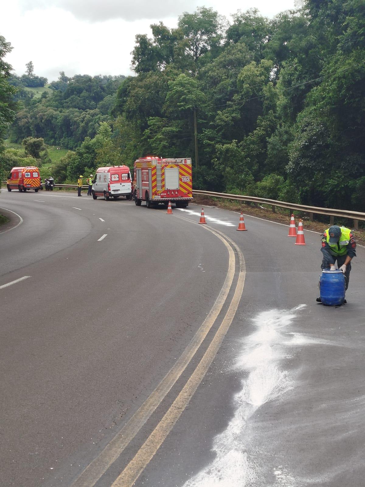 A Policia Rodoviária Estadual estava no local prestando apoio. Foi ainda colocado material absorvente na via pela suspeita de óleo na pista.