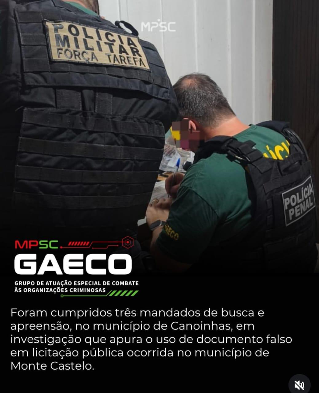 Foram cumpridos três mandados de busca e apreensão, no município de Canoinhas, em investigação que apura o uso de documento falso em licitação pública ocorrida no município de Monte Castelo.