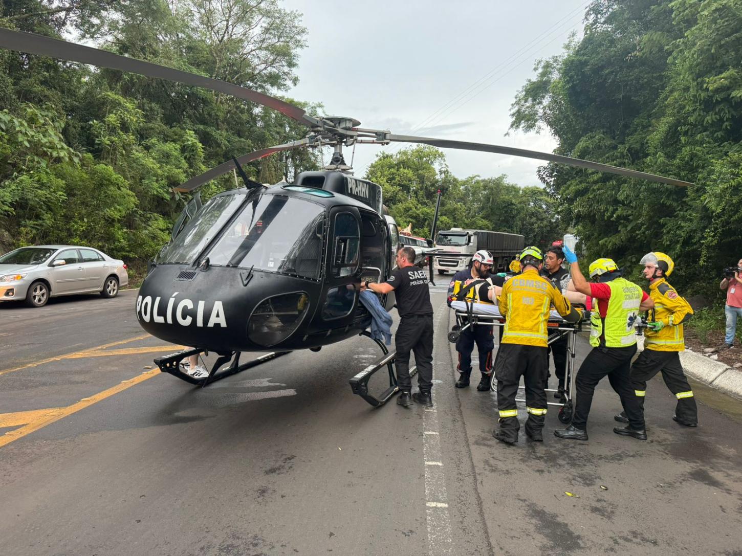 Na tarde de ontem (29), a aeronave da Polícia Civil tripulada pelos policiais do SAER-Fron e pelos profissionais do SAMU/Aeromédico, foi acionada para atendimento primário em acidente de trânsito na BR-282, em Cordilheira Alta, envolvendo dois caminhões e três automóveis.