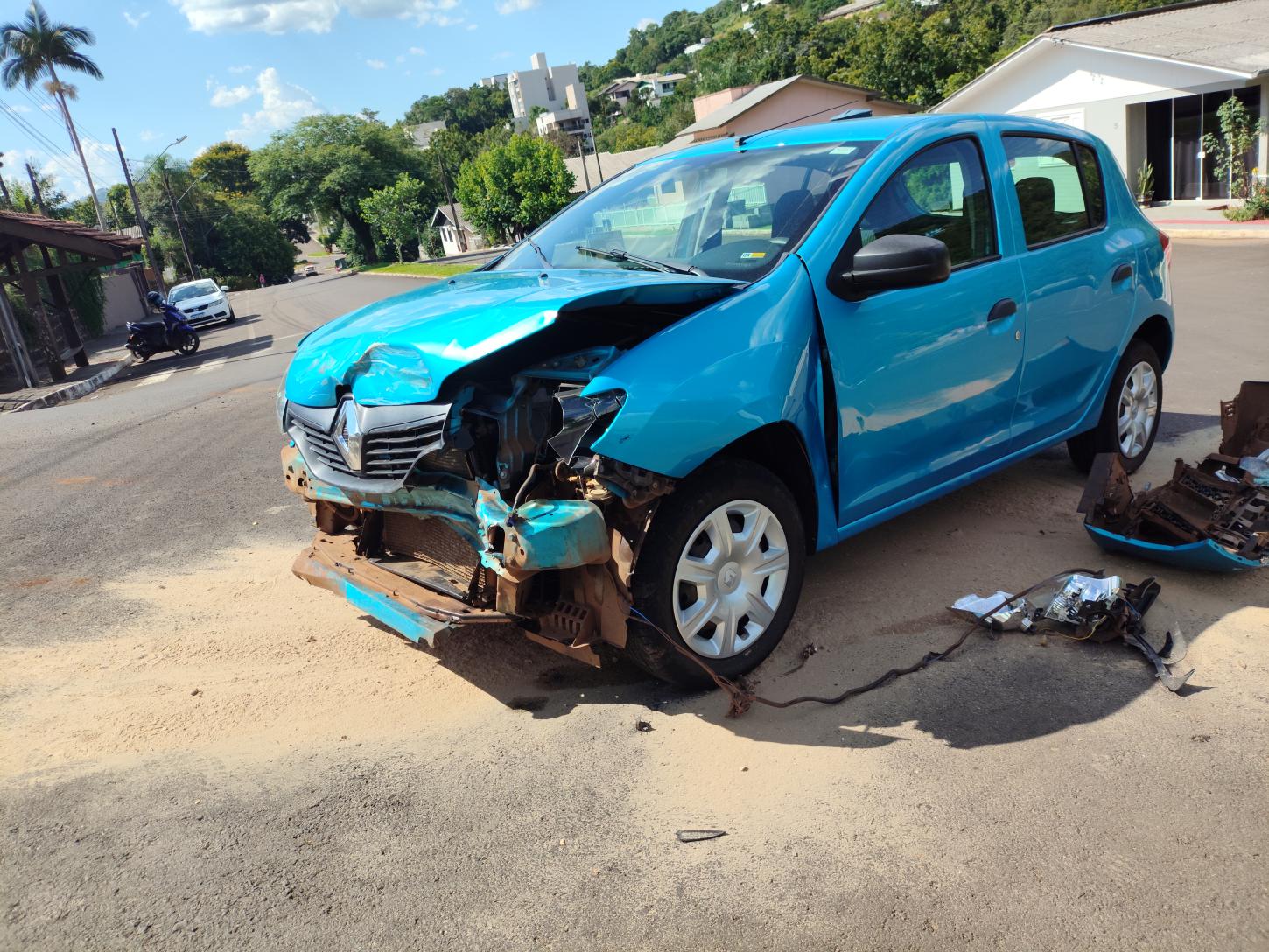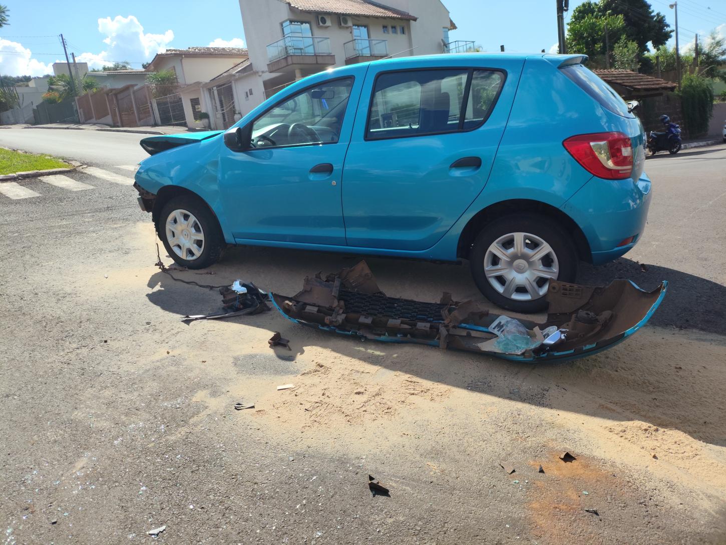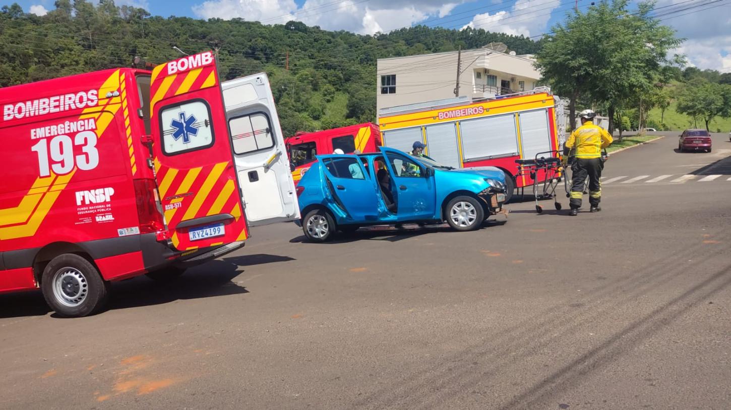 No local, foi confirmada a natureza da ocorrência, tratando-se de colisão entre um veículo Sandero, que subia na rua de acesso ao ginásio municipal e um Monza que transitava na Av. Primo A Bodanese.