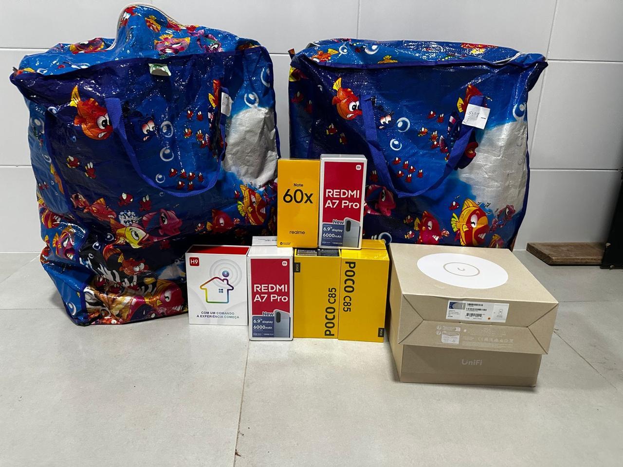 No bagageiro, foram identificadas mercadorias de outros dois passageiros, um de 31 e outro de 29 anos, que transportavam eletrônicos sem documentação fiscal e acima da cota permitida, incluindo smartphones, notebook e roteadores. As mercadorias, avaliadas em cerca de R$ 20 mil, foram apreendidas e serão encaminhadas à Receita Federal.