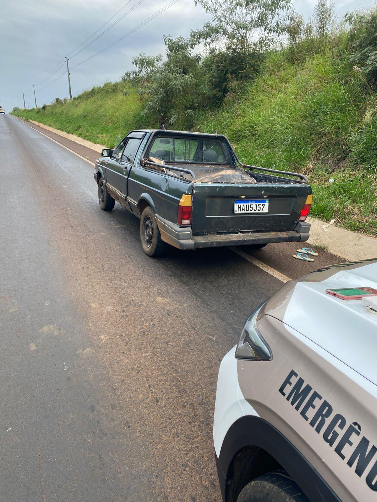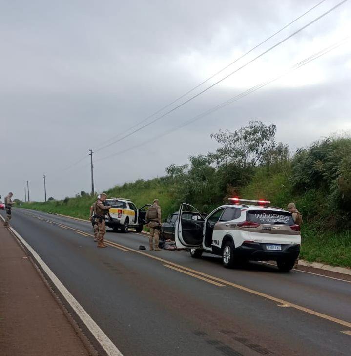 Após receber informações do furto, as guarnições iniciaram buscas e localizaram o veículo transitando em rodovia no sentido Bom Jesus–Xanxerê. A ordem de parada não foi acatada e os suspeitos tentaram fugir a pé, sendo contidos pelas equipes.