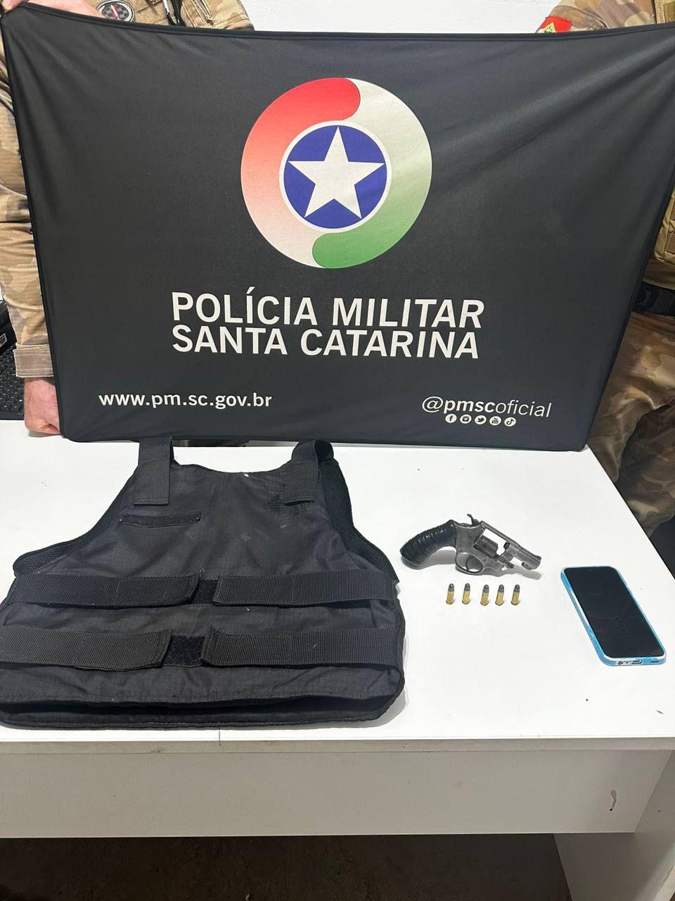 Durante as buscas, foi encontrado sob o colchão de uma das crianças um revólver marca Taurus, calibre .32, carregado com cinco munições, bem como um colete balístico. O homem assumiu a propriedade do material apreendido.