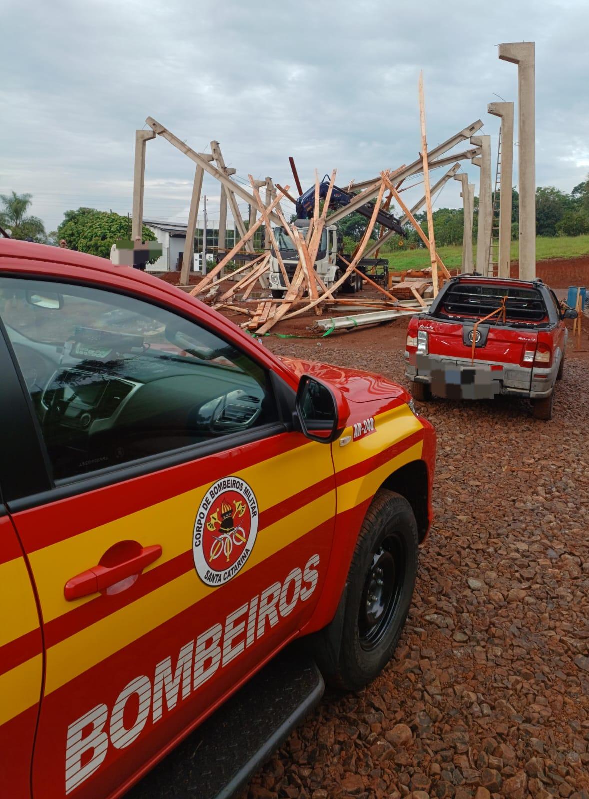 Por volta das 08h18, o Trem de socorro do Corpo de Bombeiros de Itapiranga foi acionado para atendimento de queda de estrutura do tipo Galpão Pré-moldado. Deslocado ao local, sito a rodovia ITG-070, em linha laranjeira, onde foi constatado que 02 masculinos os quais estavam sobre a estrutura, sofreram queda durante a fixação das travessas de madeira após toda a estrutura ceder, ocasionando a queda de ambos.