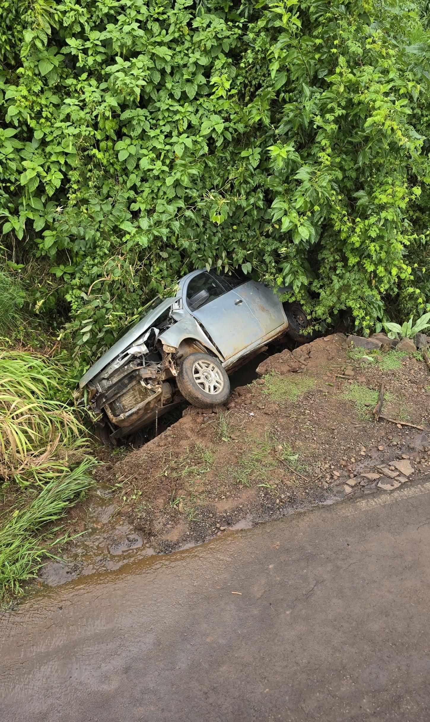Ao chegar no local a GU deparou-se com Volkswagen Voyage branco, que, segundo ocupantes, sofreu saída de pista seguida de capotamento, parando lateralizado sobre córrego.
