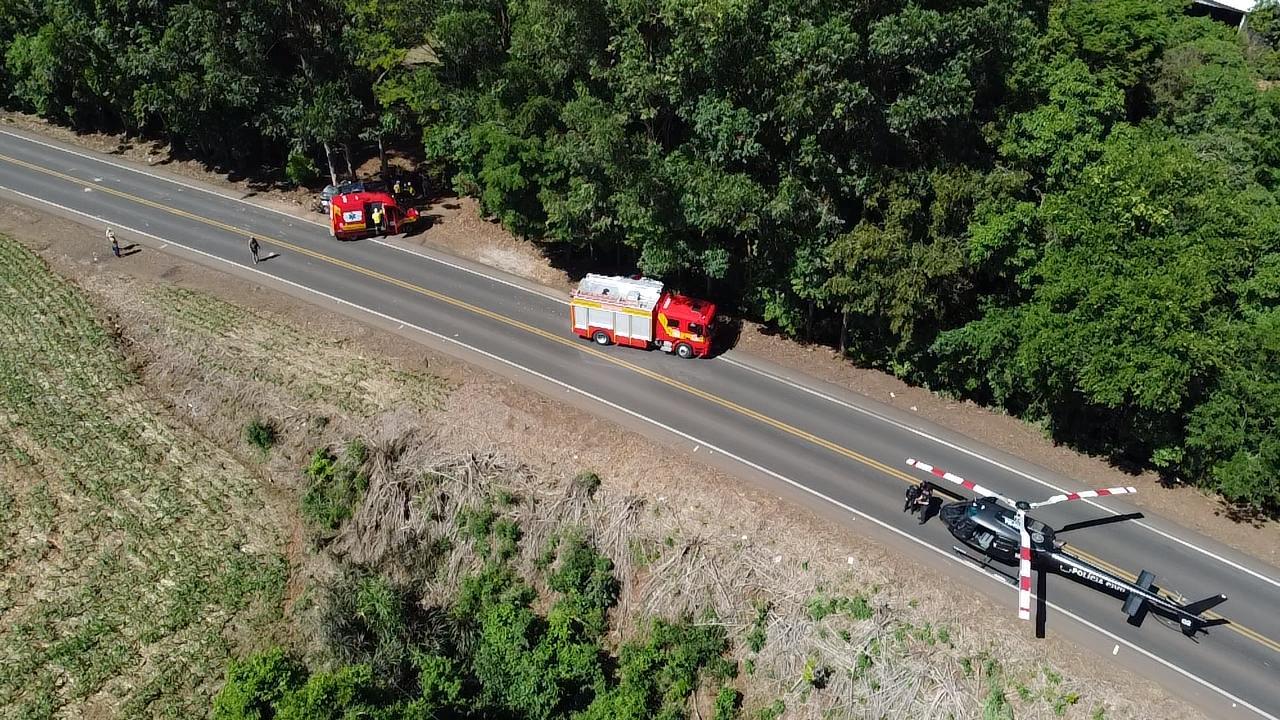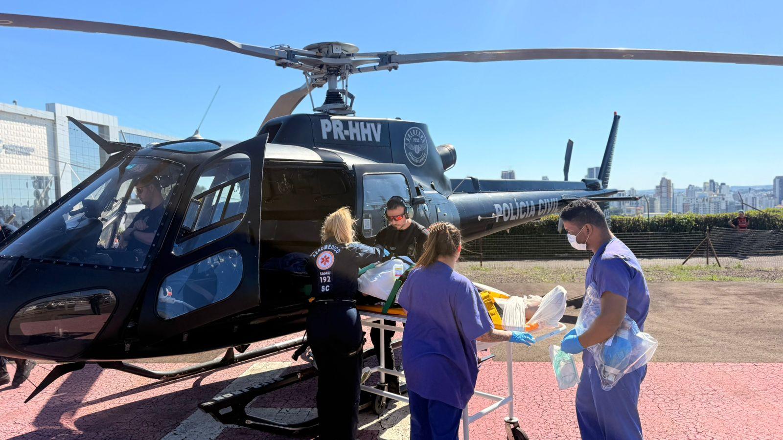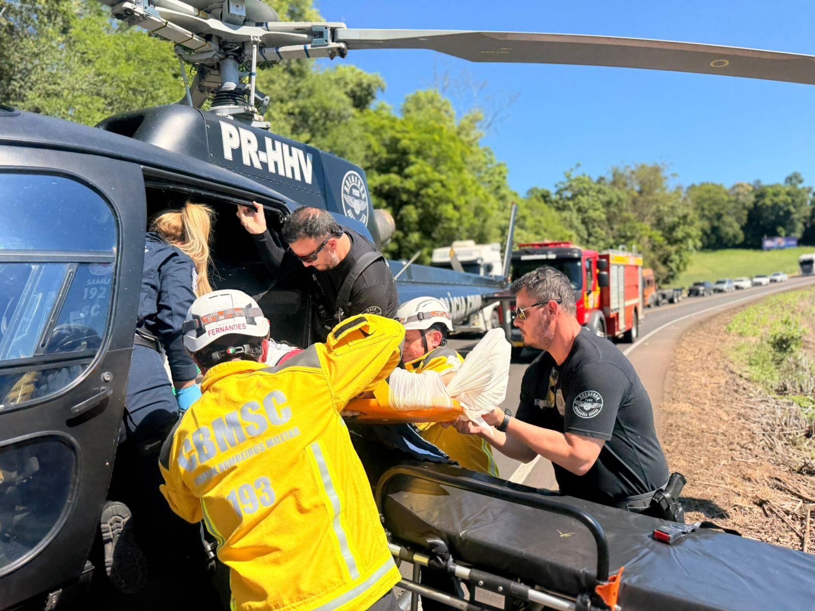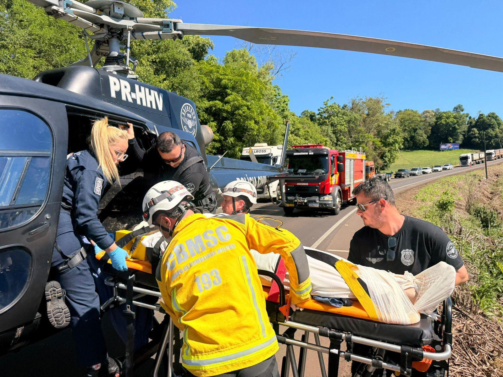 O passageiro do banco da frente, masculino, 40 anos com fratura na clavícula, costelas, perna esquerda e cotovelo esquerdo e suspeita de fratura na coluna. Foi estabilizado e conduzido ao Hospital Regional do Oeste em Chapecó pelo helicóptero.